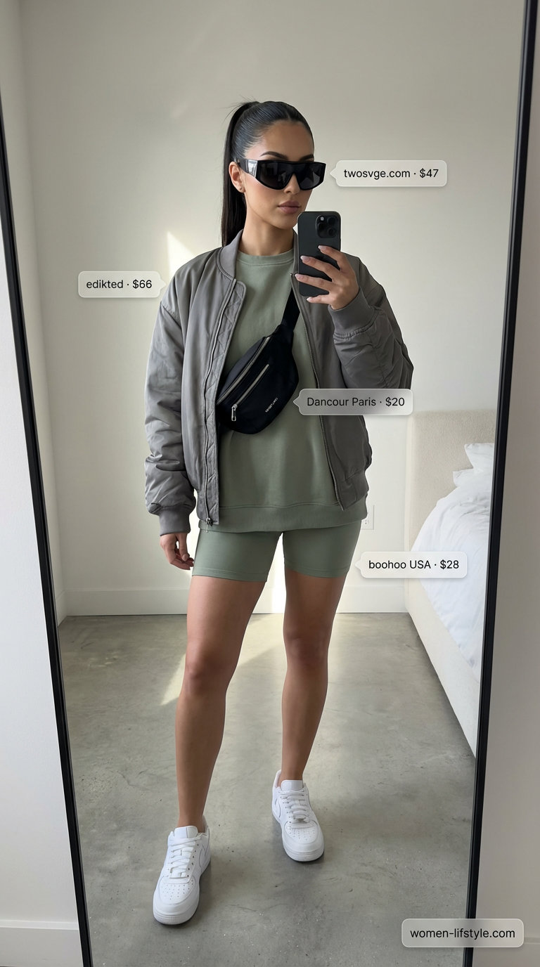 Charcoal gray and black monochromatic base with white sneaker accents—this is the athleisure formula that reads intentional on a city sidewalk. The oversized graphic tee ($32) sits loose enough to move over biker shorts without tenting, and that proportion balance matters because volume without definition reads costume-y. 819 reviews, 4.85 stars. Cotton jersey retains its shape after multiple washes with no pilling or color fade—real durability at entry-level price. This outfit works errands, casual coffee, or genuine city transit without changing.
